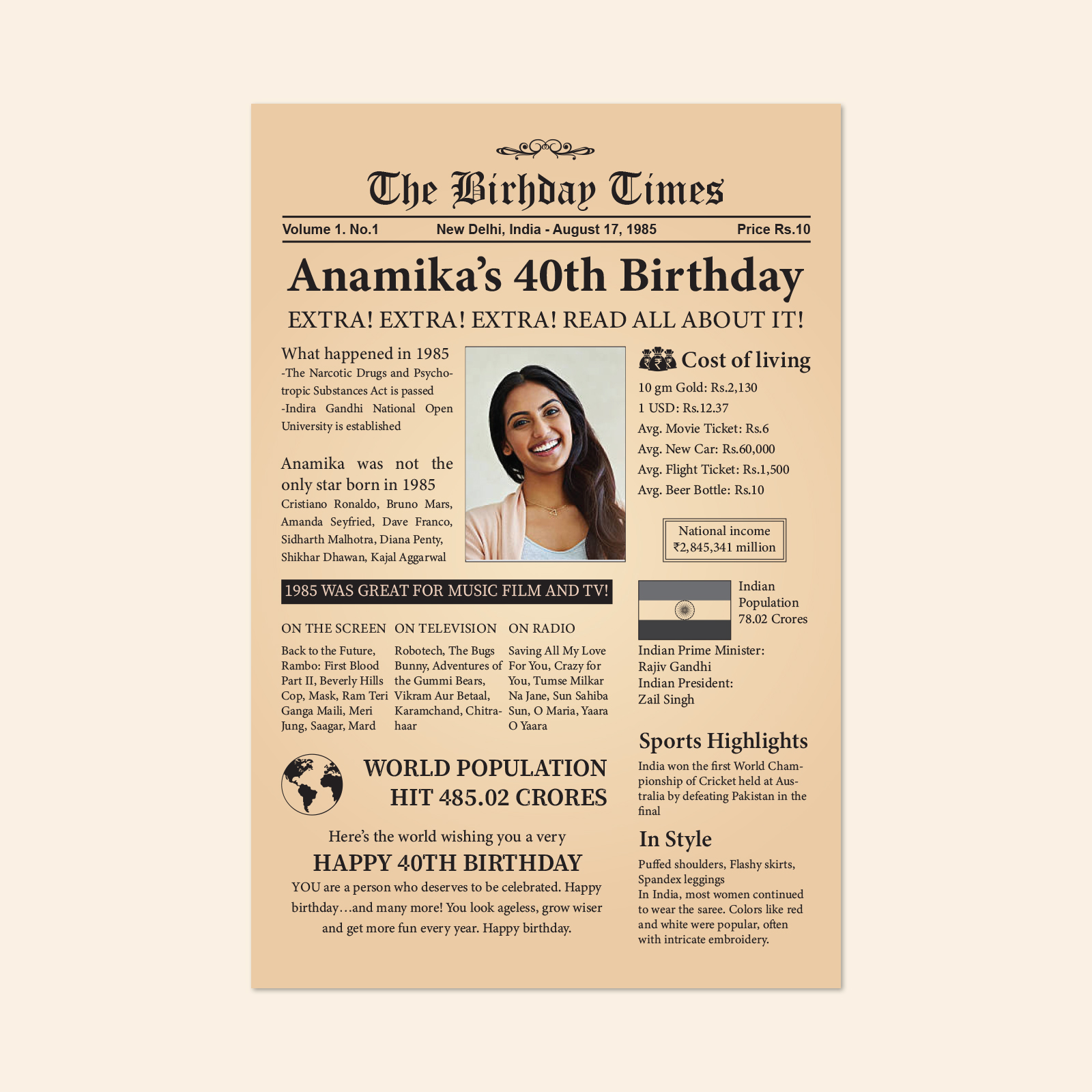 Give the gift of nostalgia with “The Birthday Times” personalized newspaper print! This unique present takes the recipient back to their birth year (e.g., 1985), showcasing interesting facts about the world, popular culture, and even the cost of living at the time. Personalized with their name and birthday, this print is a fascinating glimpse into the past and a wonderful way to celebrate their special day.